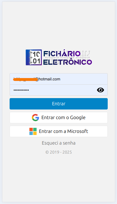 Em seguida faça login no formulário abaixo, você também pode usar os botões do Google e da Microsoft, e caso você não se lembre da senha é possível criar outra, utilizando o link em cinza Esqueci a senha: